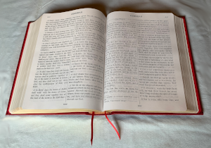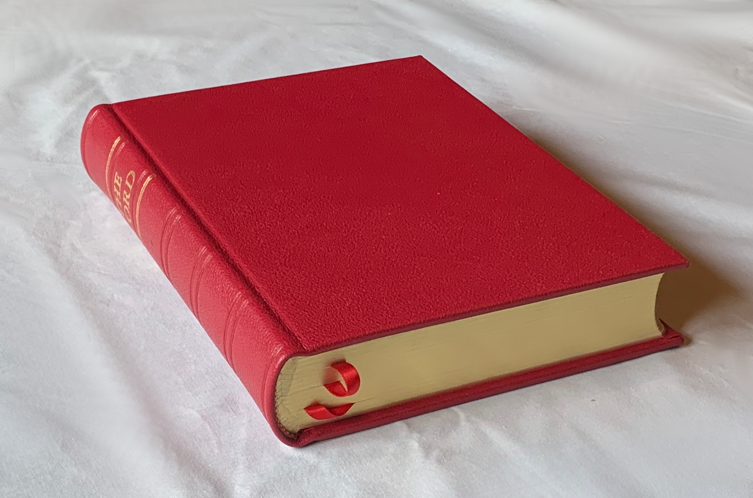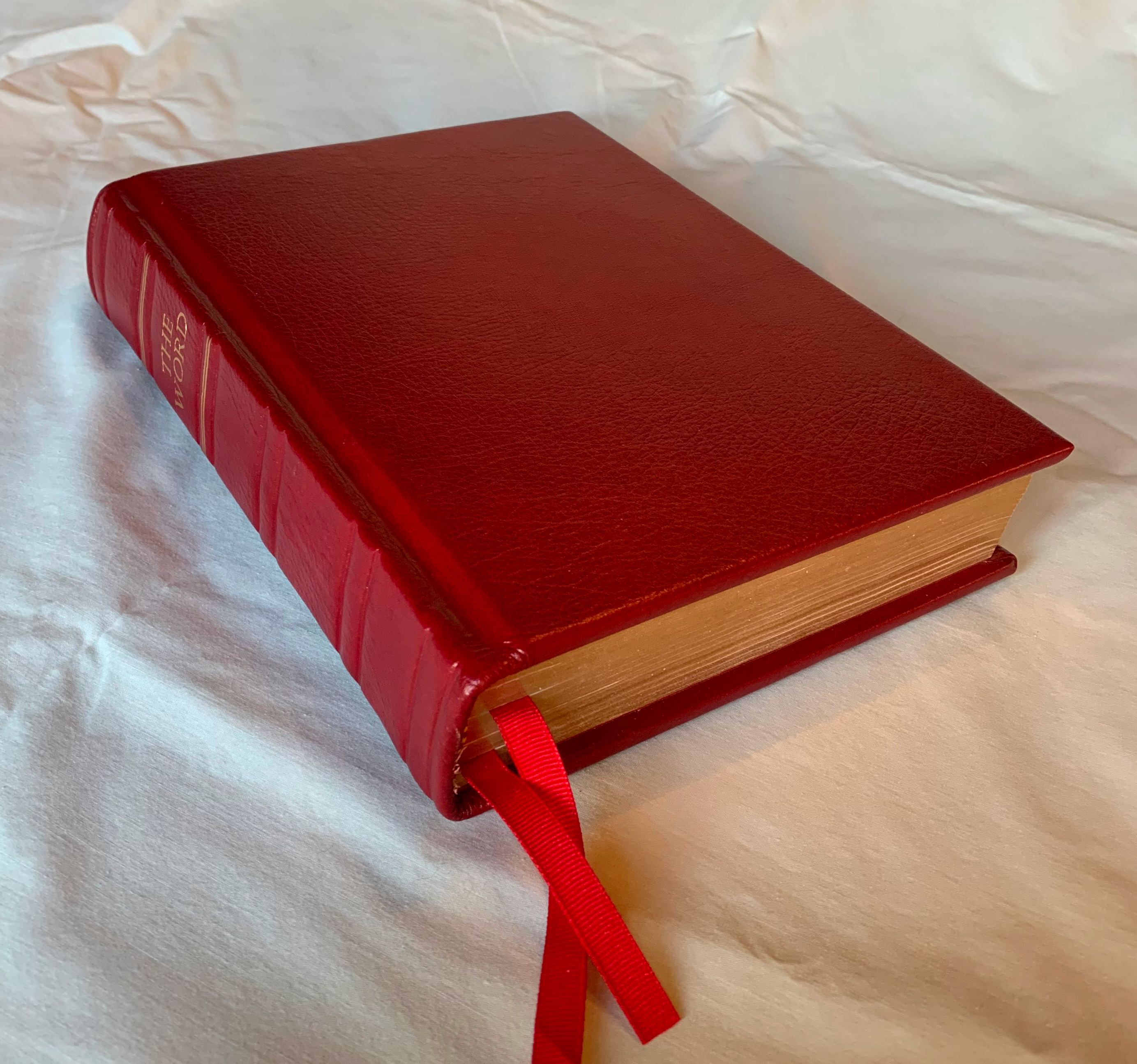 The cover is red calfskin. The spine is stamped with "The Word" in real gold. The page edges are gilded, and the page corners are square.