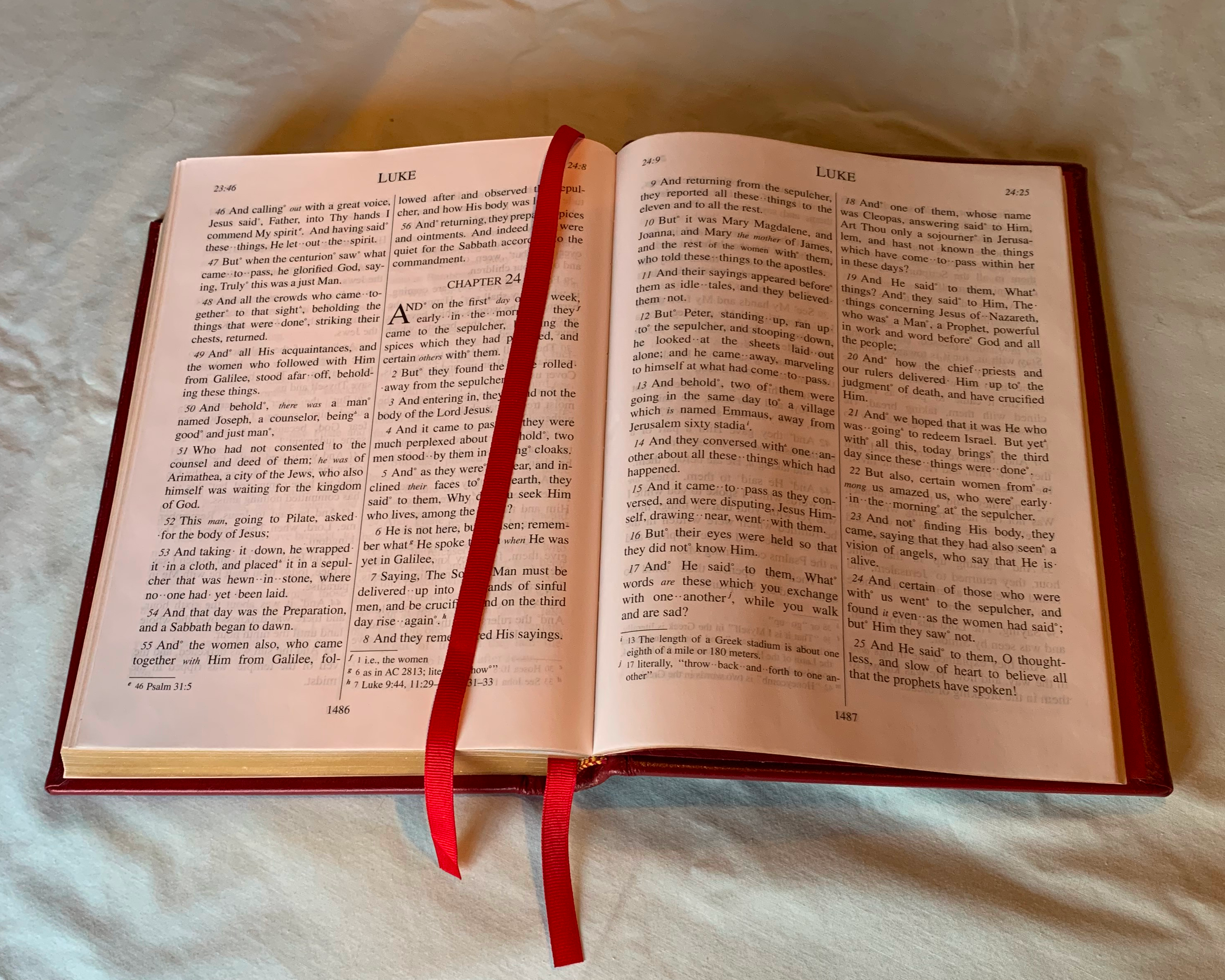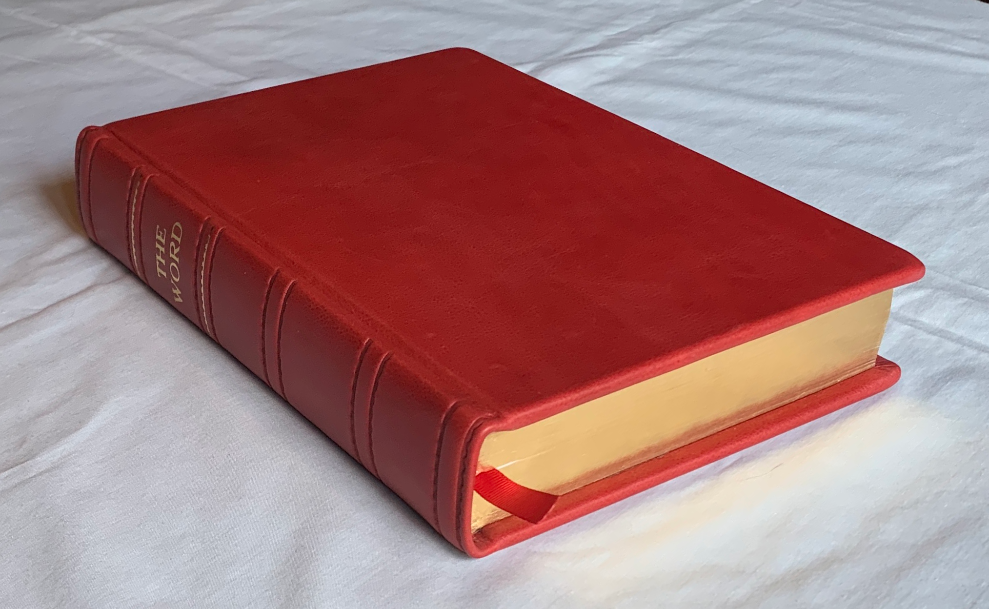 The cover is red calfskin. The spine is stamped with "The Word" in real gold. The page edges are gilded, and the page corners are square.