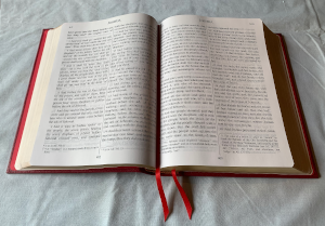 The cover is red calfskin. The spine is stamped with "The Word" in real gold. The page edges are gilded, and the page corners are rounded.